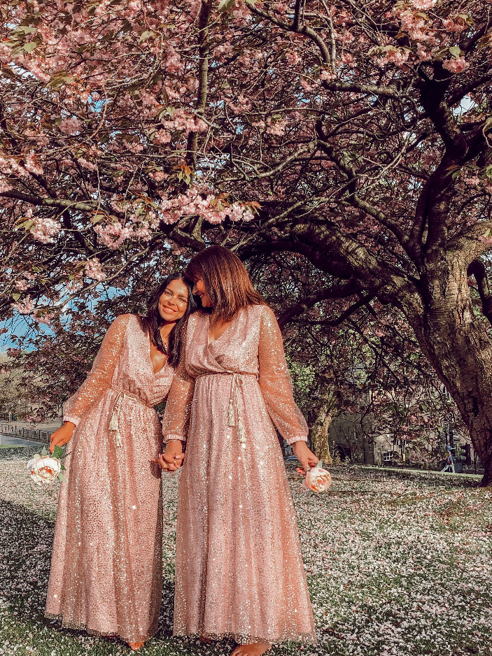 Like mother, like daughter. #matchmymum! Two flowers pose together beneath more flowers! Fashion Ma of three @beth-bartram and mum match in our Open Invitation Maxi Dress Bronze.